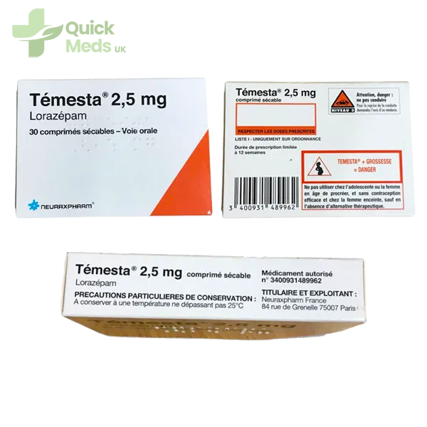 Temesta (Lorazepam) 2.5mg is a prescription benzodiazepine medication used for the short-term management of severe anxiety disorders, anxiety-related insomnia, and as a pre-anesthetic sedative. It works by enhancing the effects of GABA in the brain to produce a calming effect.